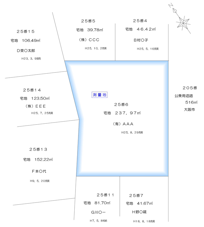 この案件においても、紛争の土地だけでなく、イラストの範囲も測量して公図の筆界形状や各土地の登記面積などをすべて把握しました。その上でP5-P1が筆界であると判断し、15ページ程度の調査報告書と図面を裁判所に提出しました。上記の報酬は、依頼人の弁護士との度重なる打ち合わせや裁判所に提出する報告書作成費用を含んだものです。